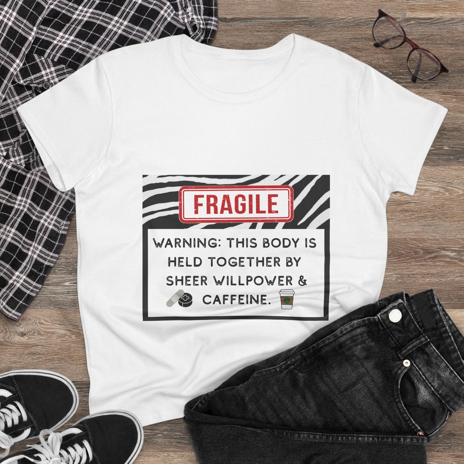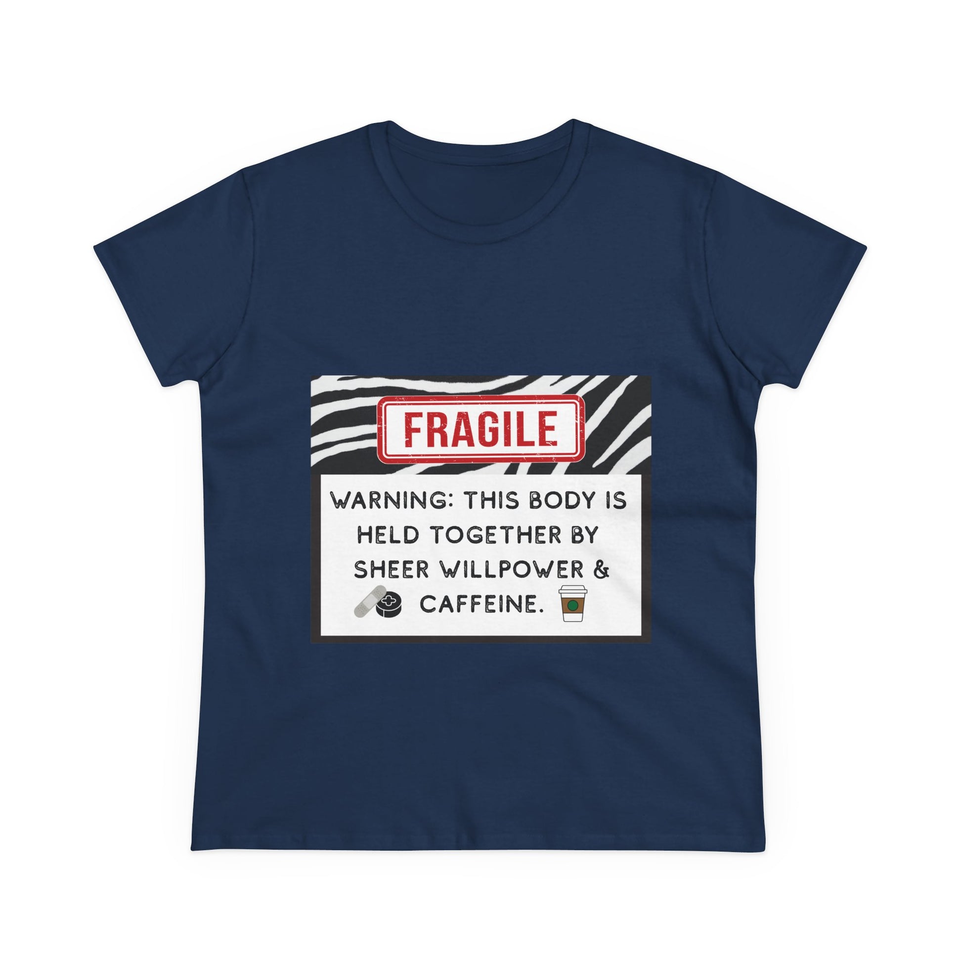 Warning: This Body is Held Together by Sheer Willpower & Caffeine – Snarky EDS/Zebra Warrior T-Shirt